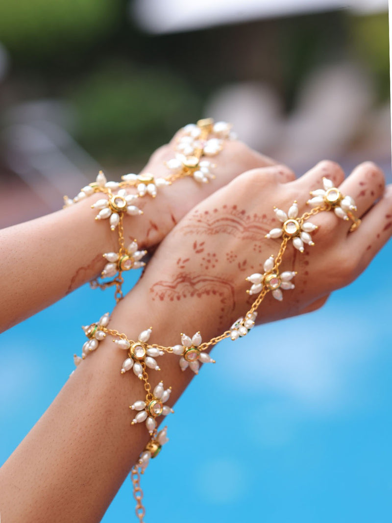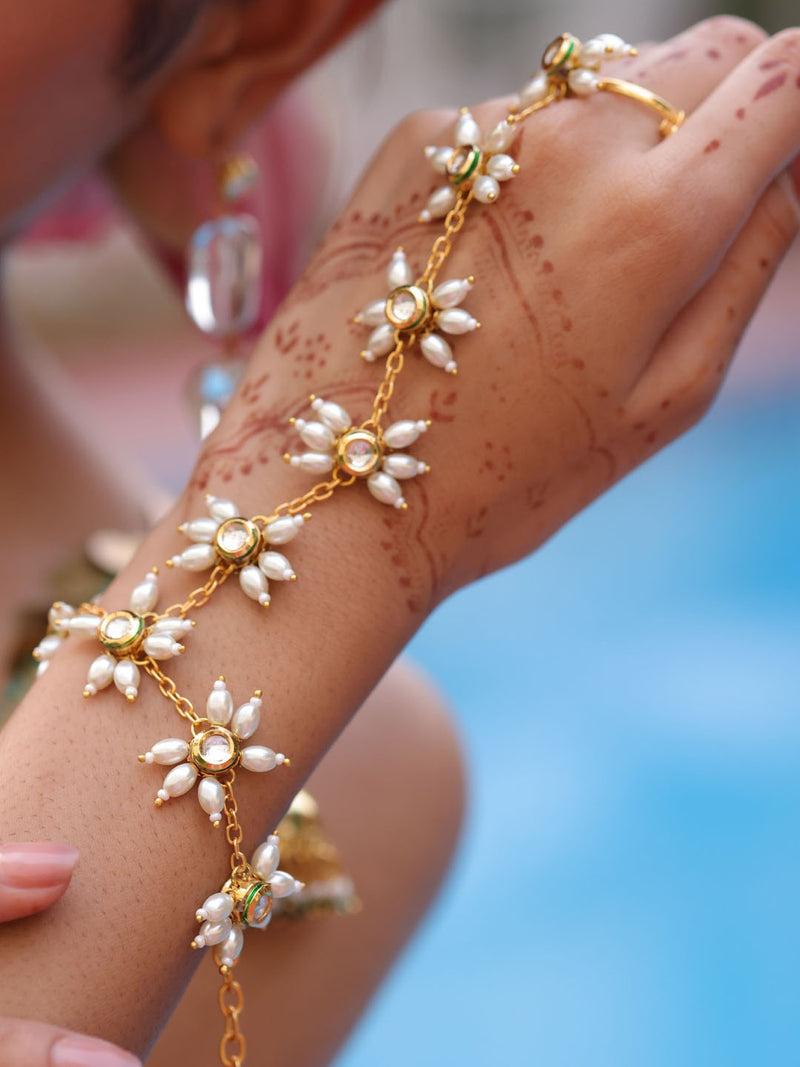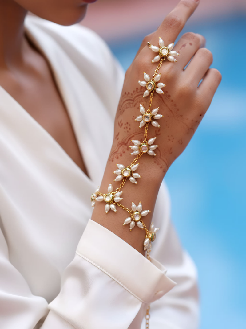 The Regal Bloom Kundan Hathphool enchants with its blend of luminous pearls and radiant kundan stones, gracefully linking the ring to the bracelet in a floral symphony of elegance. Each detail reflects fine craftsmanship and royal allure.