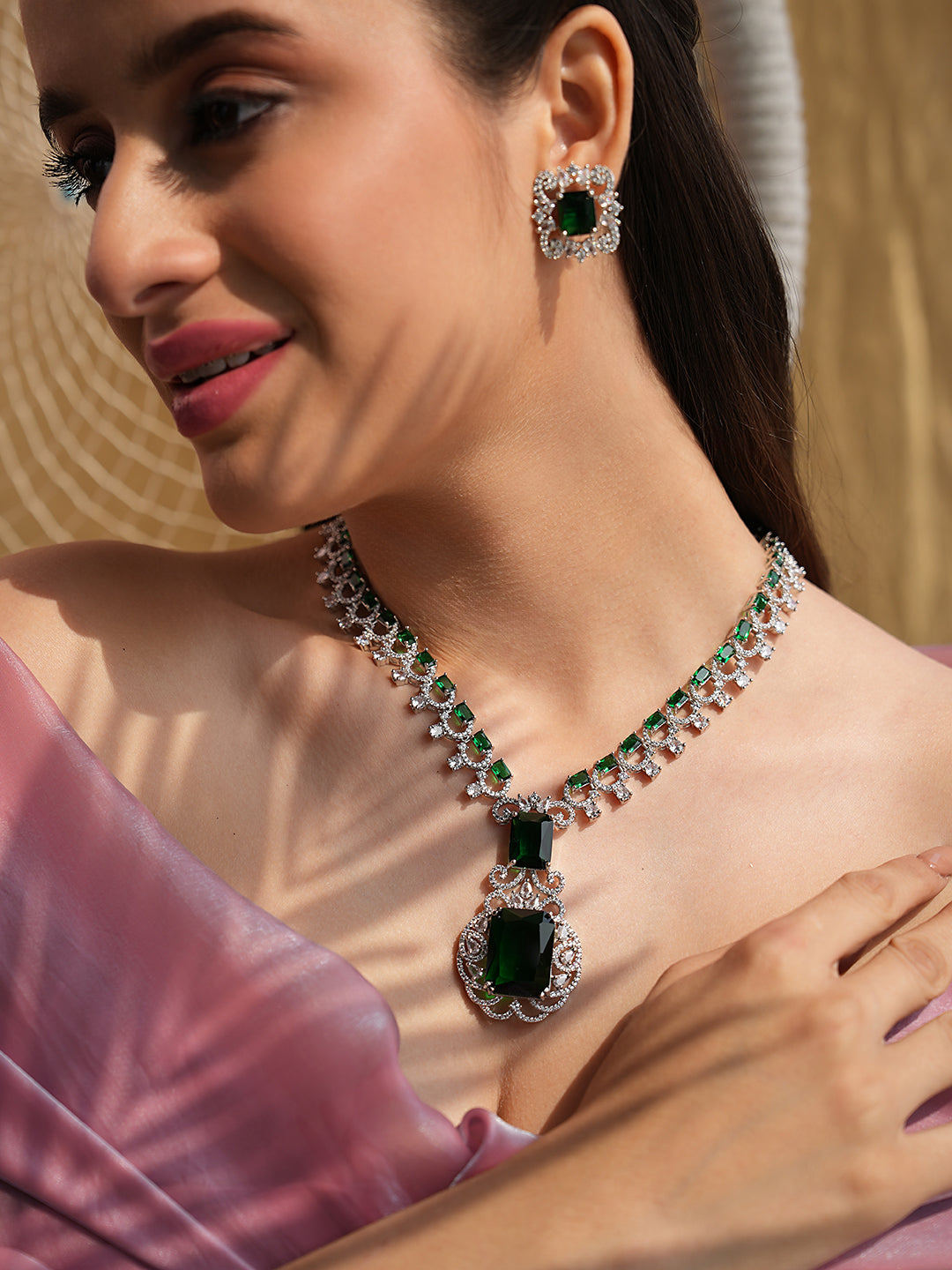 The set includes a captivating necklace complemented by matching emerald-studded earrings, adding an extra layer of elegance to your ensemble. Whether you're attending a grand celebration or a formal event, this jewelry set enhances your look with its regal charm and timeless beauty.