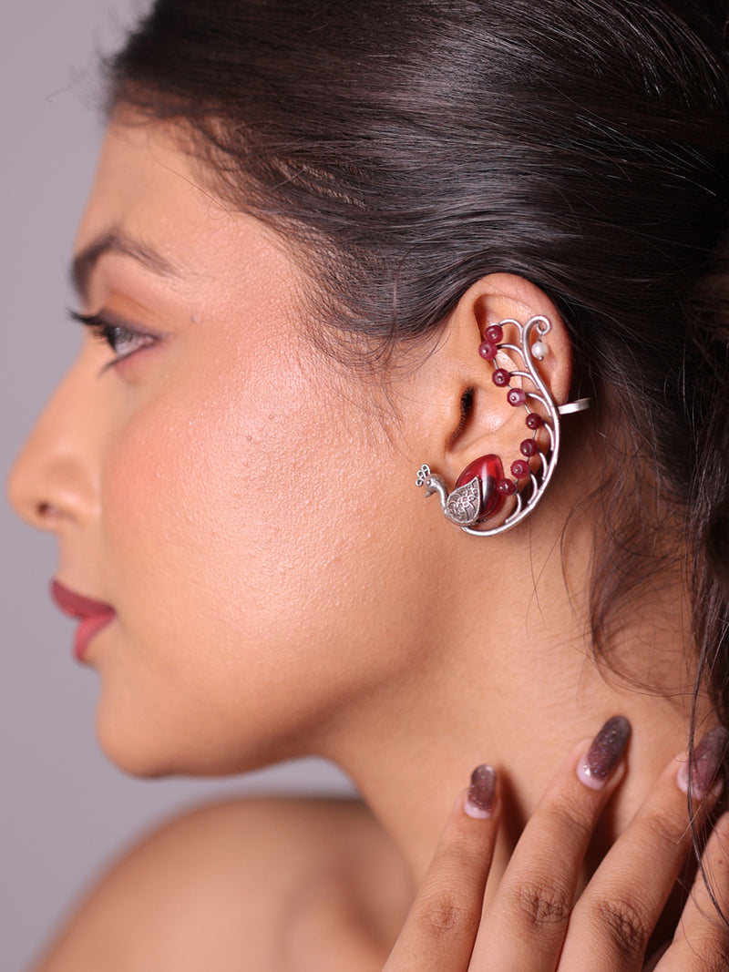 Make a regal statement with this stunning earcuff, inspired by the majestic allure of the peacock. Intricately designed with feather-like detailing and adorned with rich red tones, this piece embodies confidence, beauty, and bold self-expression. Its striking design captures the timeless splendor of nature’s most elegant bird.