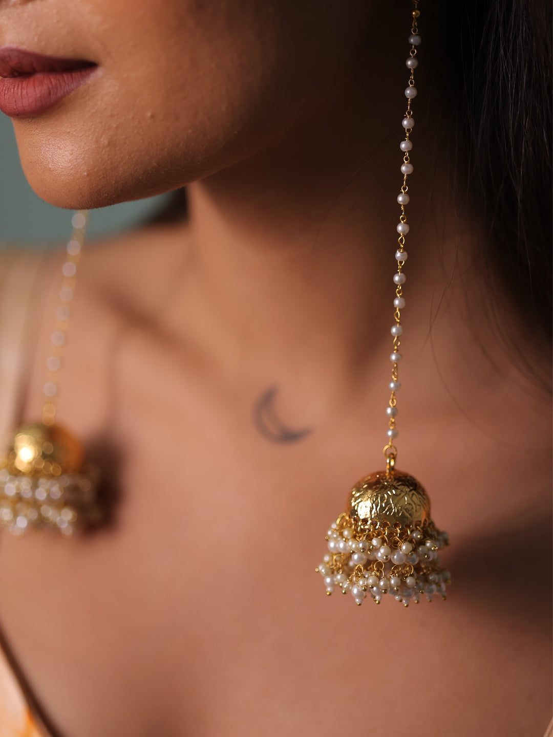 The elongated silhouette and delicate detailing ensure these jhumkas enhance both formal and festive looks effortlessly. The cascading pearls bring a soft, luminous touch, adding a sense of refinement to your ensemble.