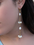 Elegant and fluid, the Amaira Rice Pearl Drop Earrings feature cascading strands of delicate rice pearls set on a warm brass base. Designed to sway with every movement, they add a touch of timeless charm and softness to any look.