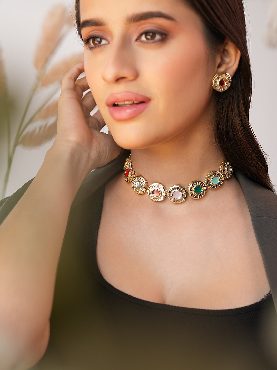 For a customizable fit, the choker is designed with a tassel at the back, allowing for easy length adjustment. Complementing the choker are matching earrings, featuring the same gold-toned setting, enamel-filled circular shapes, and embedded stones. The secure push-back closure ensures comfort and reliability, making this set a perfect choice for adding a touch of elegance to any occasion.