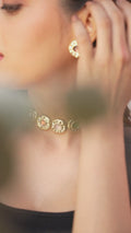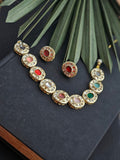 Add a touch of luxury to your jewelry collection with the Gold-Toned Enamel and Kundan Choker Set, a design that radiates vibrant elegance. The choker features several circular elements, each showcasing a colored enamel center encased in a gold-toned border, beautifully set with kundans for a luxurious and eye-catching look.