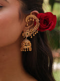 A tribute to timeless charm, this golden karnaphool jhumka blooms with intricate detailing and shimmering AD stones that catch every ray of light. The classic karnaphool stud sits gracefully on the ear, flowing into a traditional jhumka that sways with delicate movement.