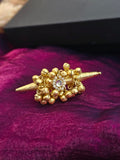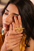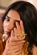 This exquisite handcrafted ring features a cluster of golden ghunghroo (bells) arranged in a floral composition, centered with a delicate Kundan-style stone framed by tiny pearls. The band displays intricate traditional engraving, enhancing its regal charm. Richly ornate yet graceful, this ring reflects classic Indian craftsmanship—perfect for festive wear, bridal ensembles, or heritage jewelry collections.