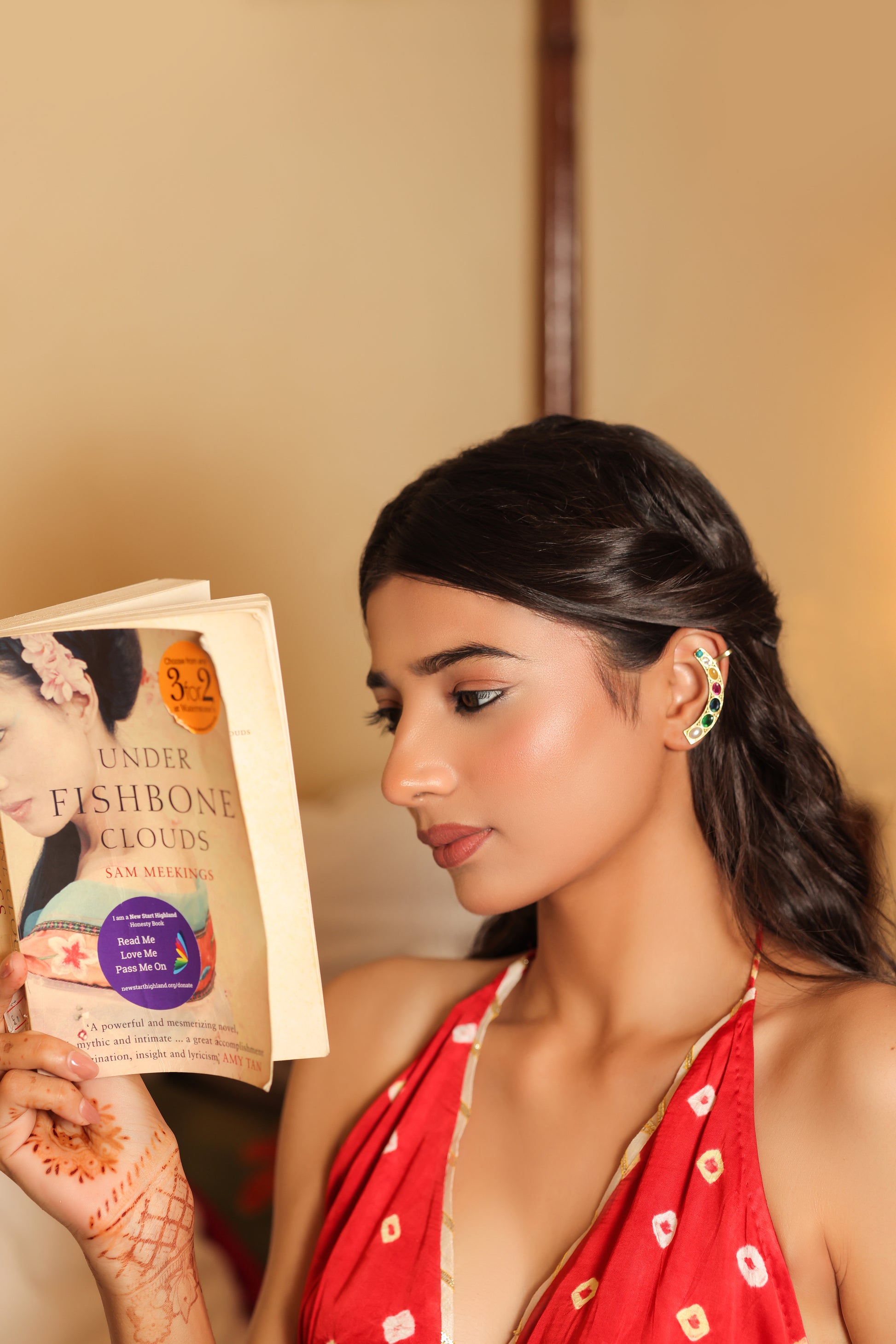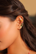 Golden crescent earcuffs decorated with colorful glass stones, offering a bright, youthful sparkle. Perfect for everyday glam or special celebrations. They shimmer like a rainbow in motion, reflecting the playful elegance that Binni carries so effortlessly.