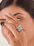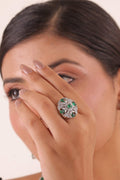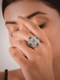 This adjustable ring features a radiant emerald green American diamond at the center, surrounded by delicate floral patterns. A perfect blend of elegance and versatility for any occasion.