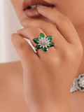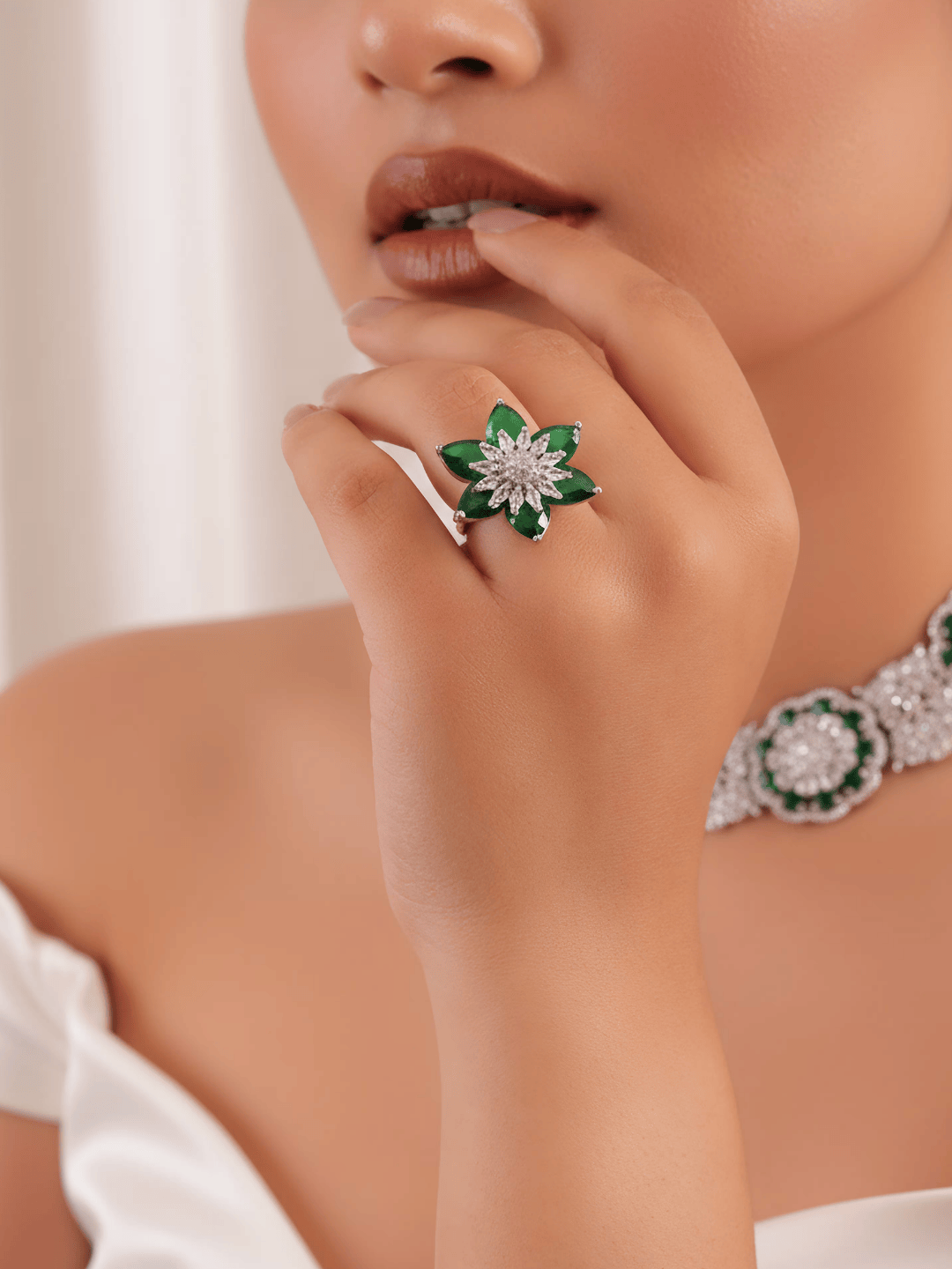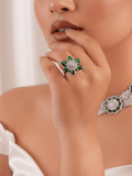 Designed in a graceful flower shape with a radiant emerald green American diamond, this ring exudes timeless charm and elegance, perfect for festive and party wear.