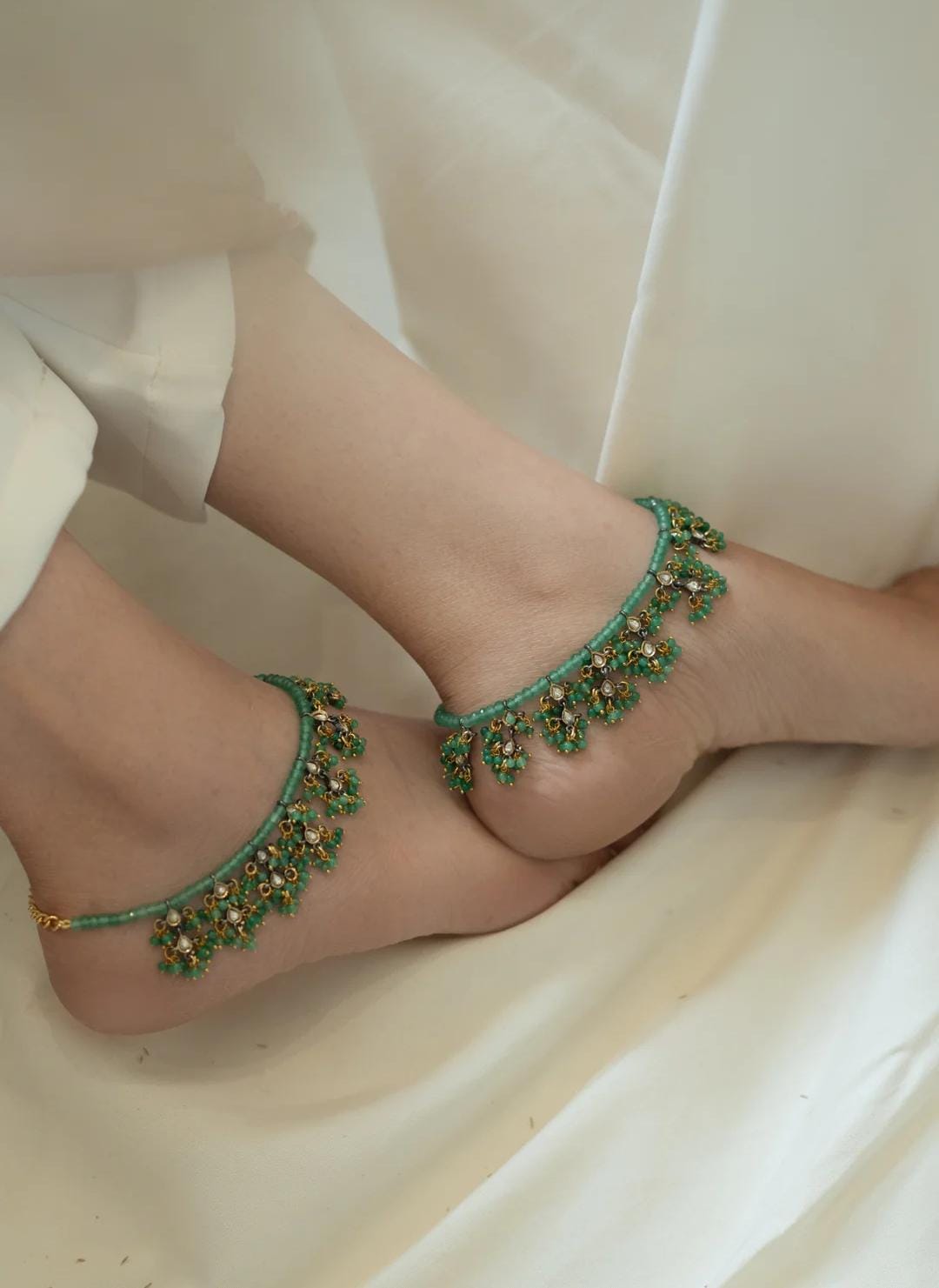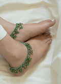 These anklets, adorned with vibrant green onyx stones and elegant pachi kundan drops, are a testament to meticulous craftsmanship. Their intricate design exudes charm, offering a delicate and sophisticated accessory for any occasion.