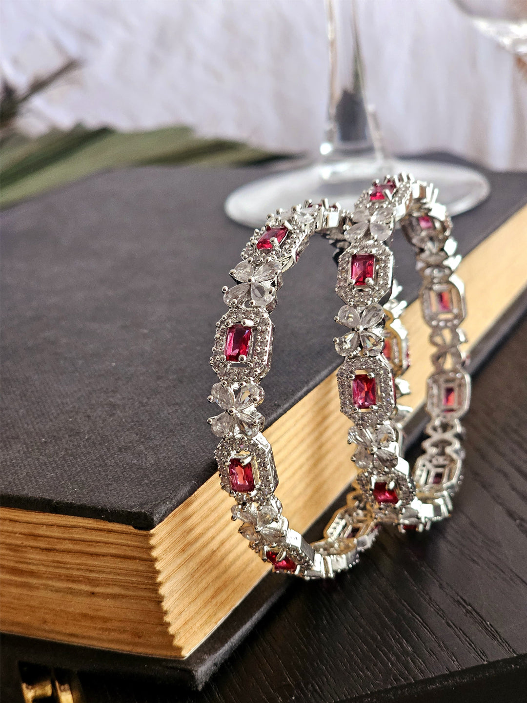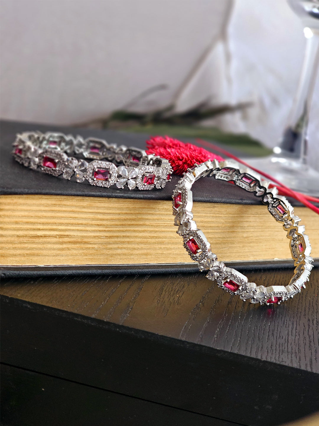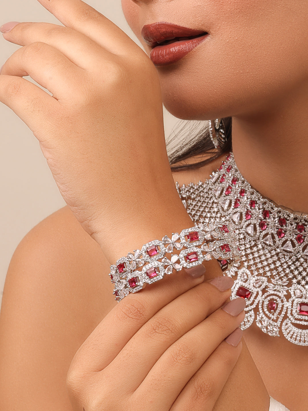 Immerse yourself in a symphony of elegance with this stunning set of two bangles, a celebration of the timeless allure of ruby-red stones and sparkling American diamonds. Vibrant rubies take center stage, beautifully complemented by a cascade of radiant diamonds, creating a harmonious blend of passion and brilliance.
