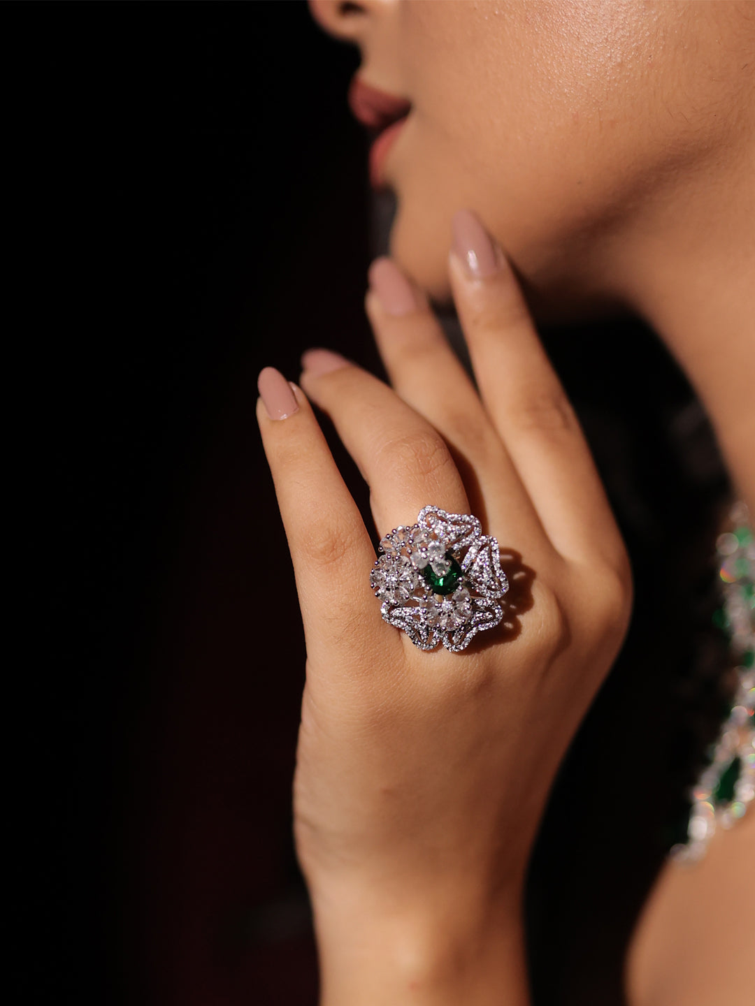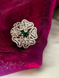 Featuring a flower-shaped design with an emerald green American diamond centerpiece, this AD-studded ring adds a graceful sparkle and charm to any festive look.