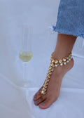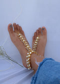 This exquisite anklet design blends timeless elegance with traditional charm, featuring large round kundans that shine with sophistication. Perfect for festive or cultural occasions, it adds a touch of regal beauty to any ensemble.