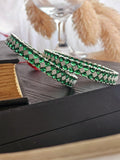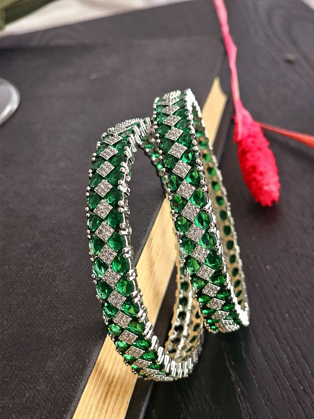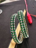 Experience the captivating charm of these bangles, where vibrant emerald-green stones intertwine seamlessly with the dazzling brilliance of clear American Diamonds. Each bangle sparkles with a radiant glow, reminiscent of serene forests and timeless natural beauty.