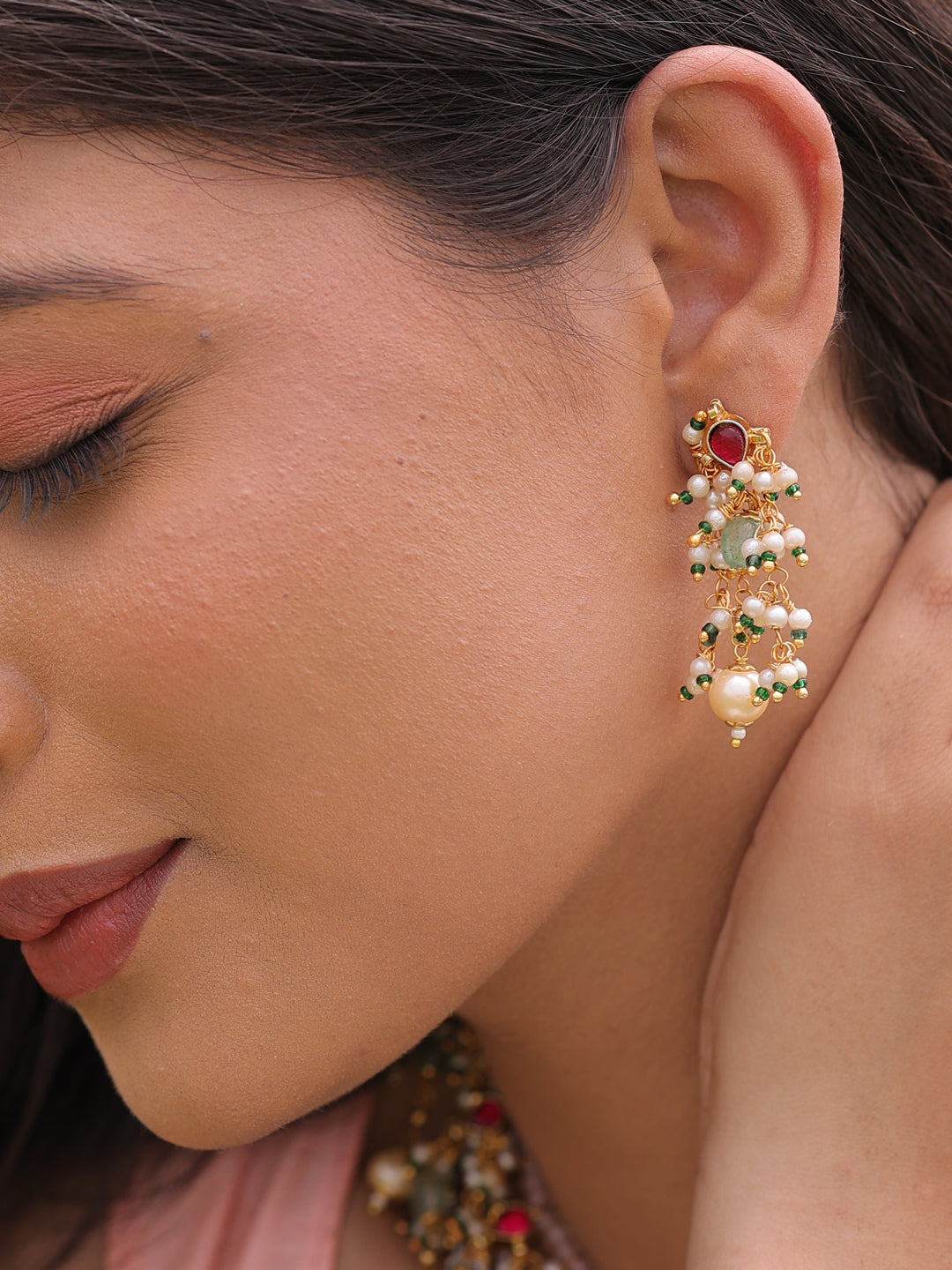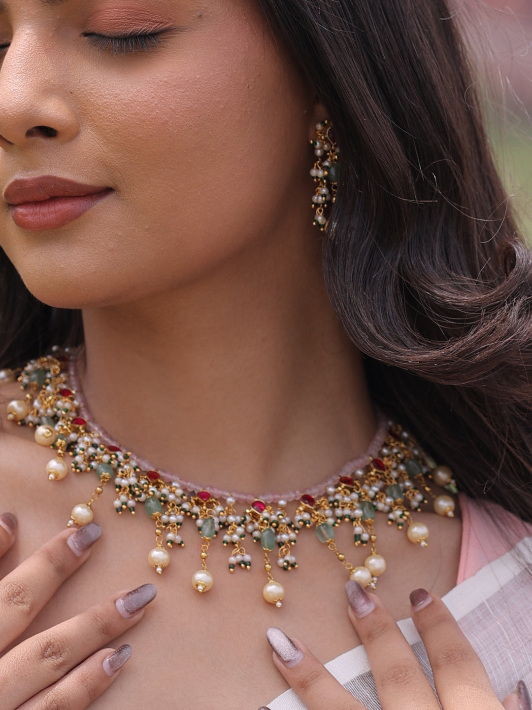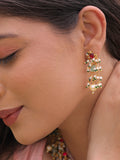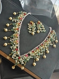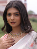 Step into a world of timeless beauty with this exquisite jewelry set, a perfect ensemble that exudes sophistication. Featuring intricate craftsmanship, it combines dangling pearls, quartz stones, delicate beads, and radiant kundans to create a design that radiates elegance and charm.