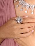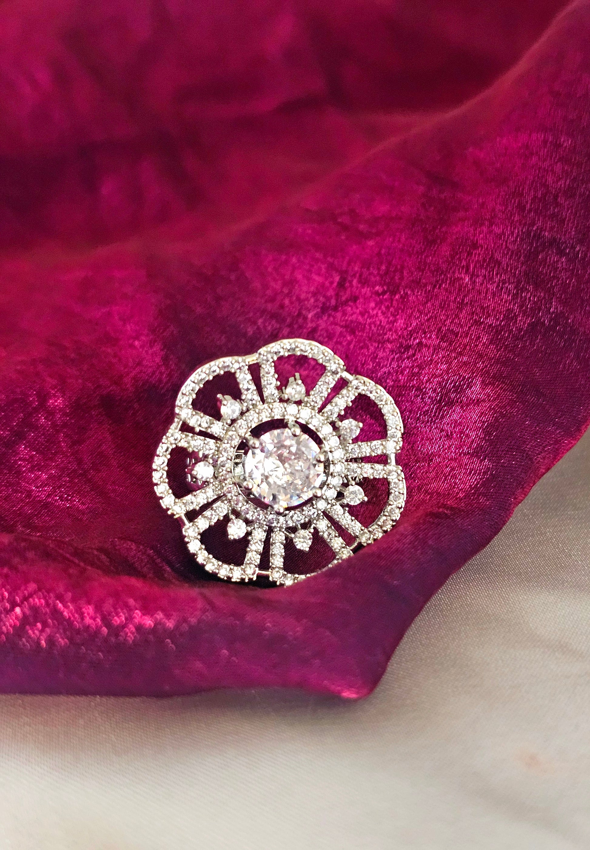 A delicate flower-shaped design adorned with clear American diamonds, this ring sparkles with timeless elegance, perfect for any festive or party look.
