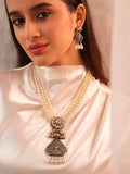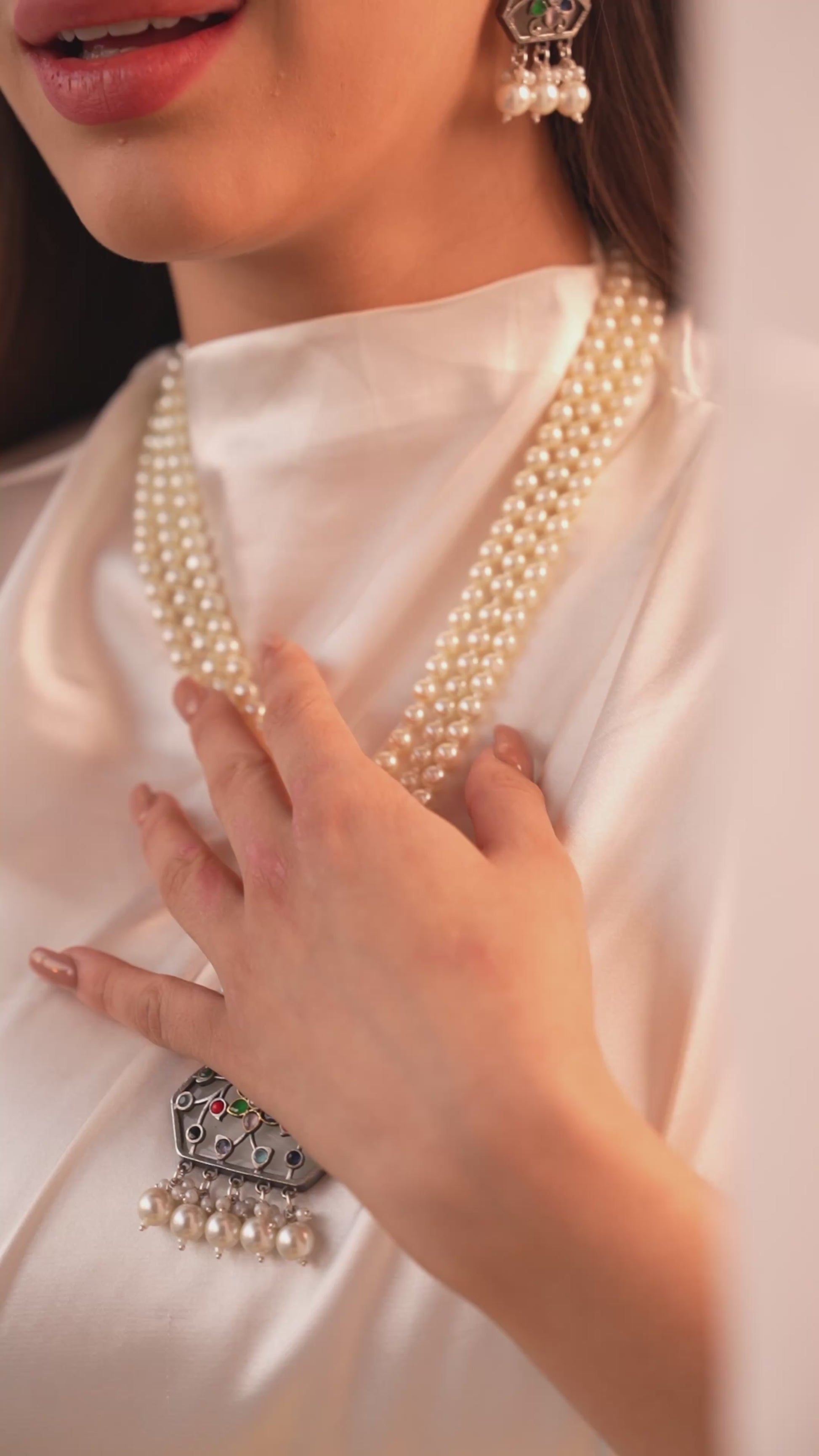 The centerpiece of the necklace is an intricately engraved German silver pendant, showcasing exquisite detailing that speaks of traditional craftsmanship. The pendant is beautifully enhanced with antique brass embellishments and adorned with delicate pearl danglings at the bottom, creating a harmonious balance of vintage charm and modern elegance. This pendant elevates the entire piece, making it a true work of art.