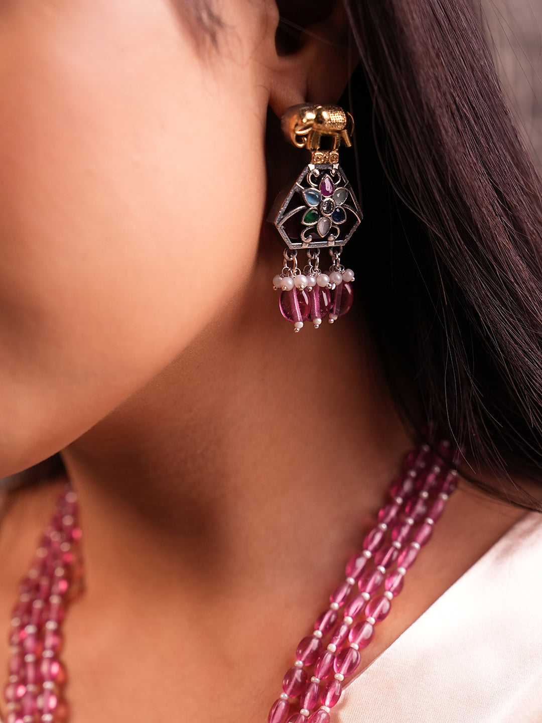 The set is completed with matching earrings, designed to captivate with their unique elephant embellishments and delicate hydro bead accents. Equipped with a push-back closure, these earrings provide a secure and comfortable fit, ensuring you can wear them effortlessly throughout the day.