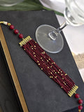 Immerse yourself in the timeless allure of the Crimson Majesty Beaded Choker. This handcrafted masterpiece features a multi-layered design in a rich maroon hue, exuding regal sophistication and undeniable charm.