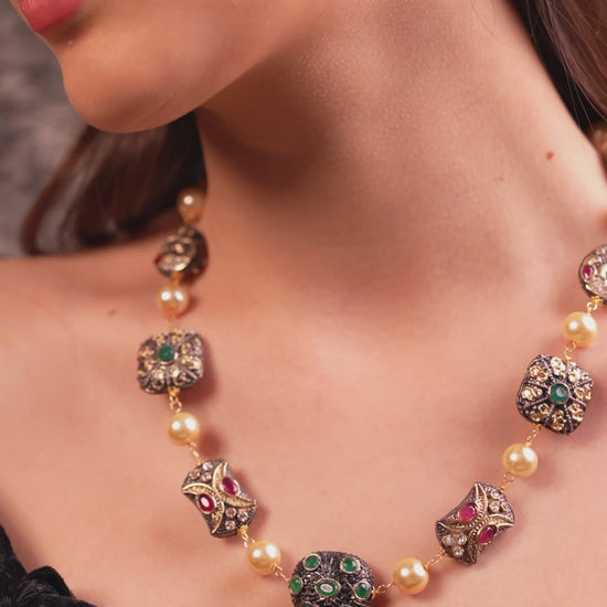 The Binnis Wardrobe Pearl and Quartz Tumble Necklace Set is a striking piece with antique black polished detailing, combining pearls and colorful quartz stones. Each quartz features vibrant kundan embellishments, while pearls and quartz alternate in a graceful sequence, creating an exquisite balance of elegance and texture. The black polish adds a vintage charm to its modern appeal.
