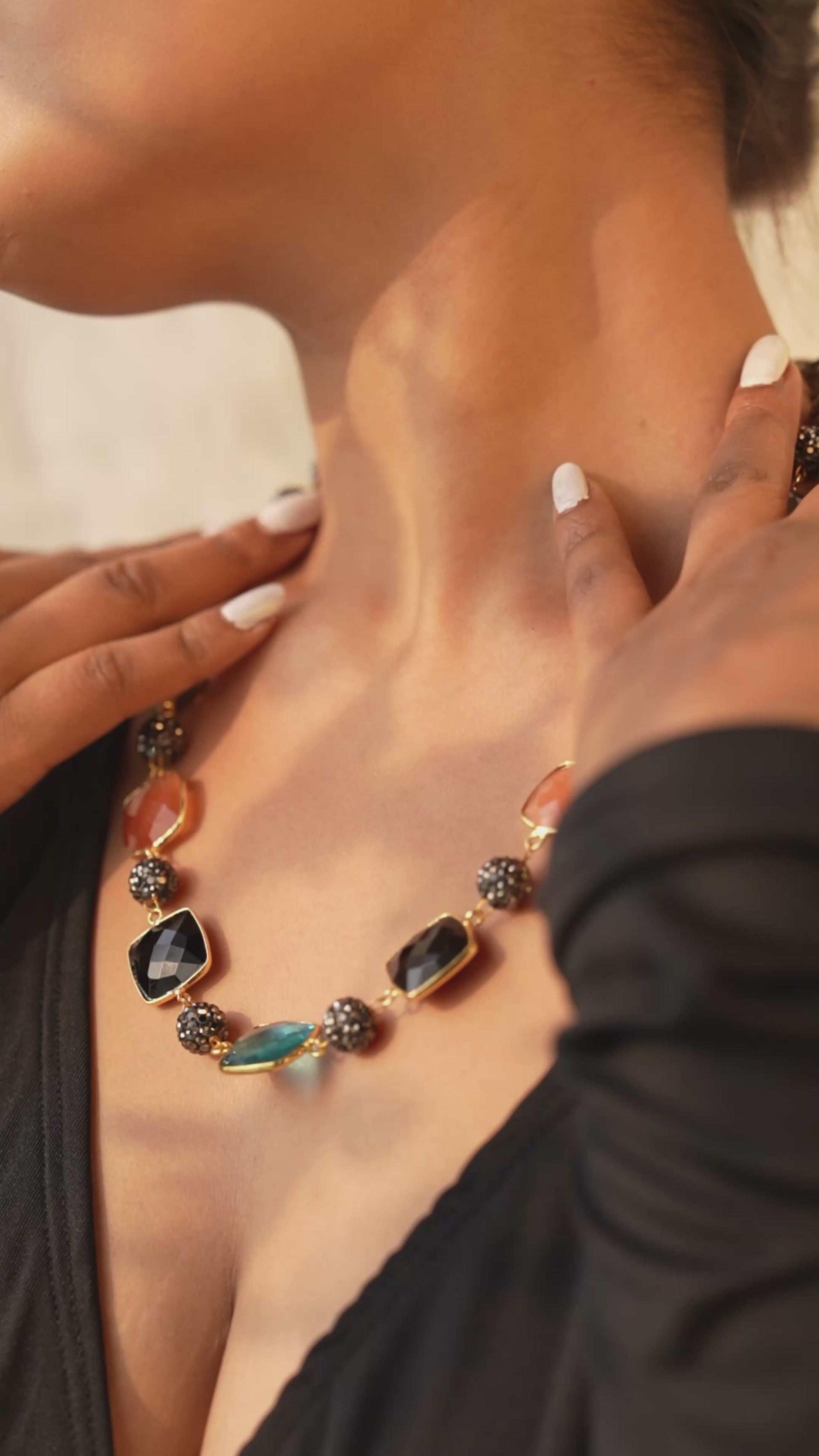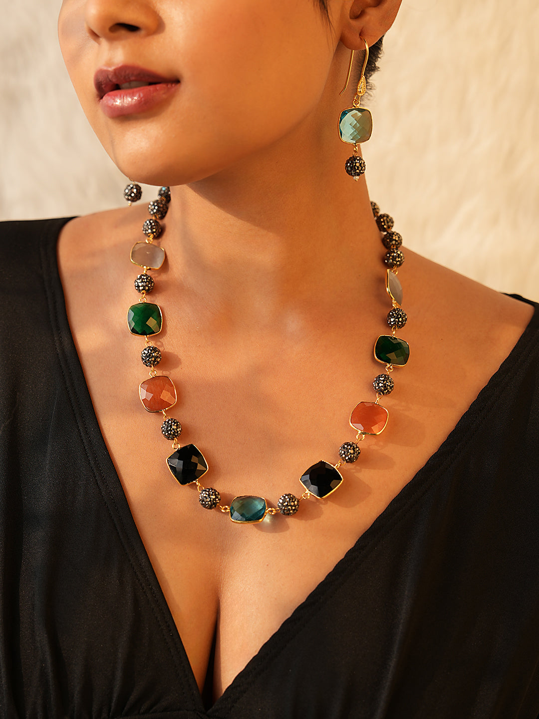 The set comes with matching hook earrings that mirror the necklace’s multicolor stone design, offering a coordinated and polished look. The lightweight and stylish earrings ensure you’ll shine effortlessly without compromising comfort.