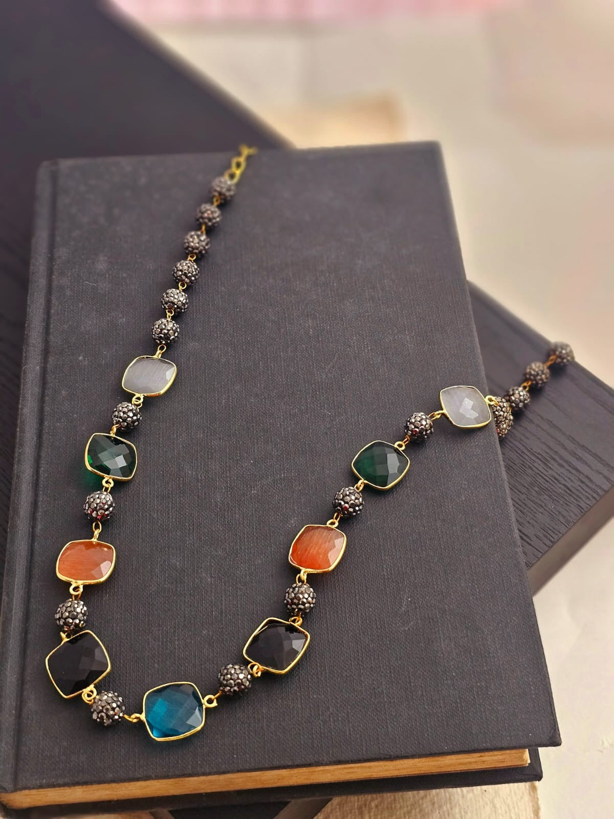 This vibrant necklace is a true statement piece, featuring an array of multicolor stones interspersed with dazzling AD tumbles that catch the light beautifully. Its radiant design exudes elegance and charm, making it the perfect accessory for festive occasions or celebratory events.