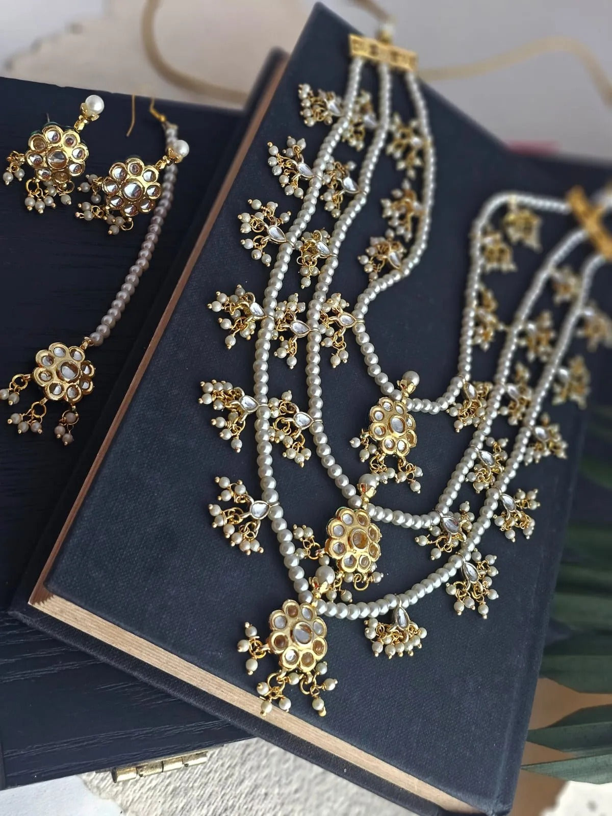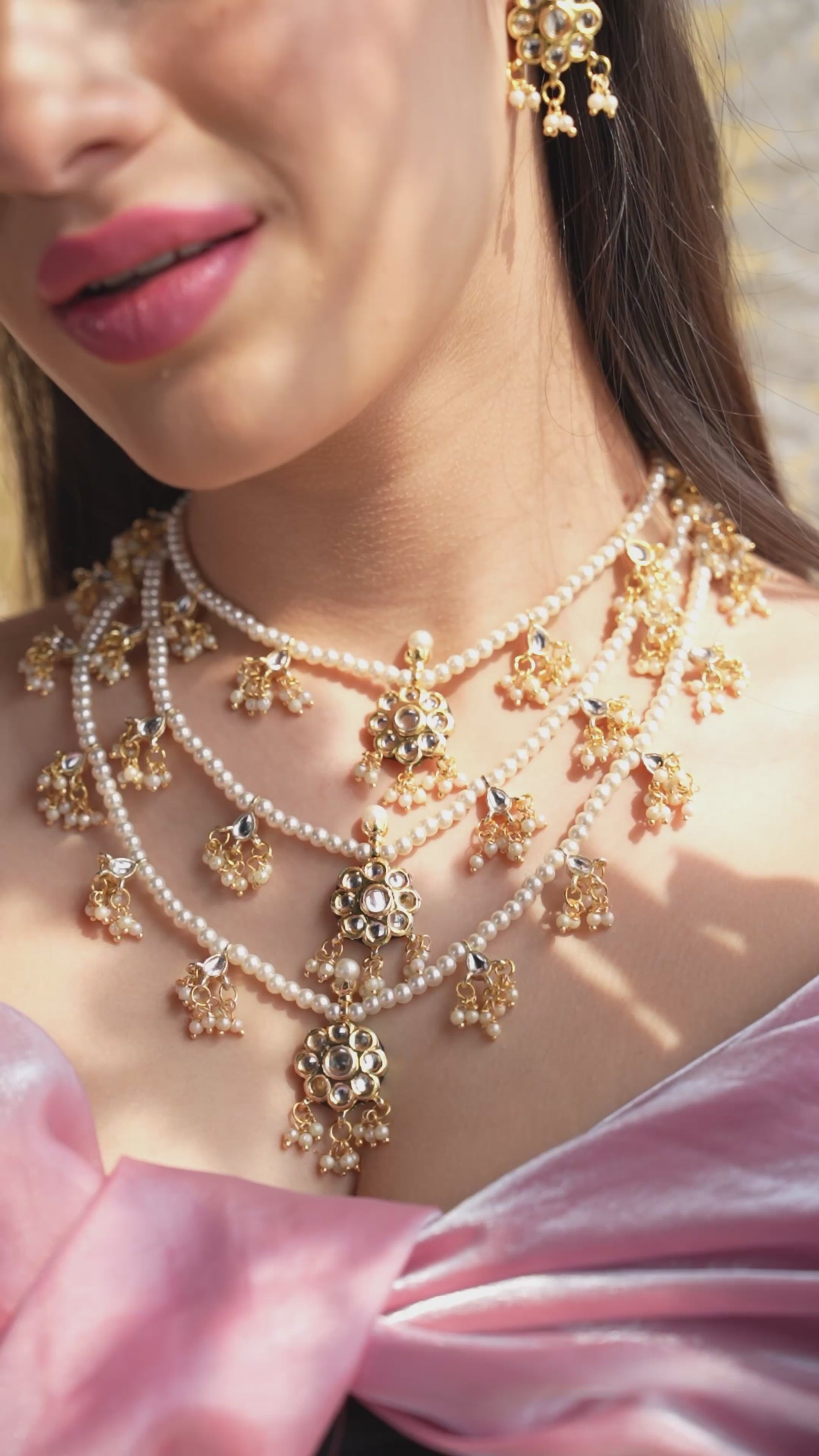 This breathtaking 3-layered necklace redefines elegance with its exquisite Kundan floral tumbles and delicate pearls, radiating a regal charm. Each layer is meticulously crafted, showcasing delicate artistry that seamlessly blends sophistication with timeless beauty.