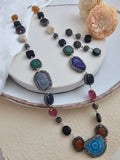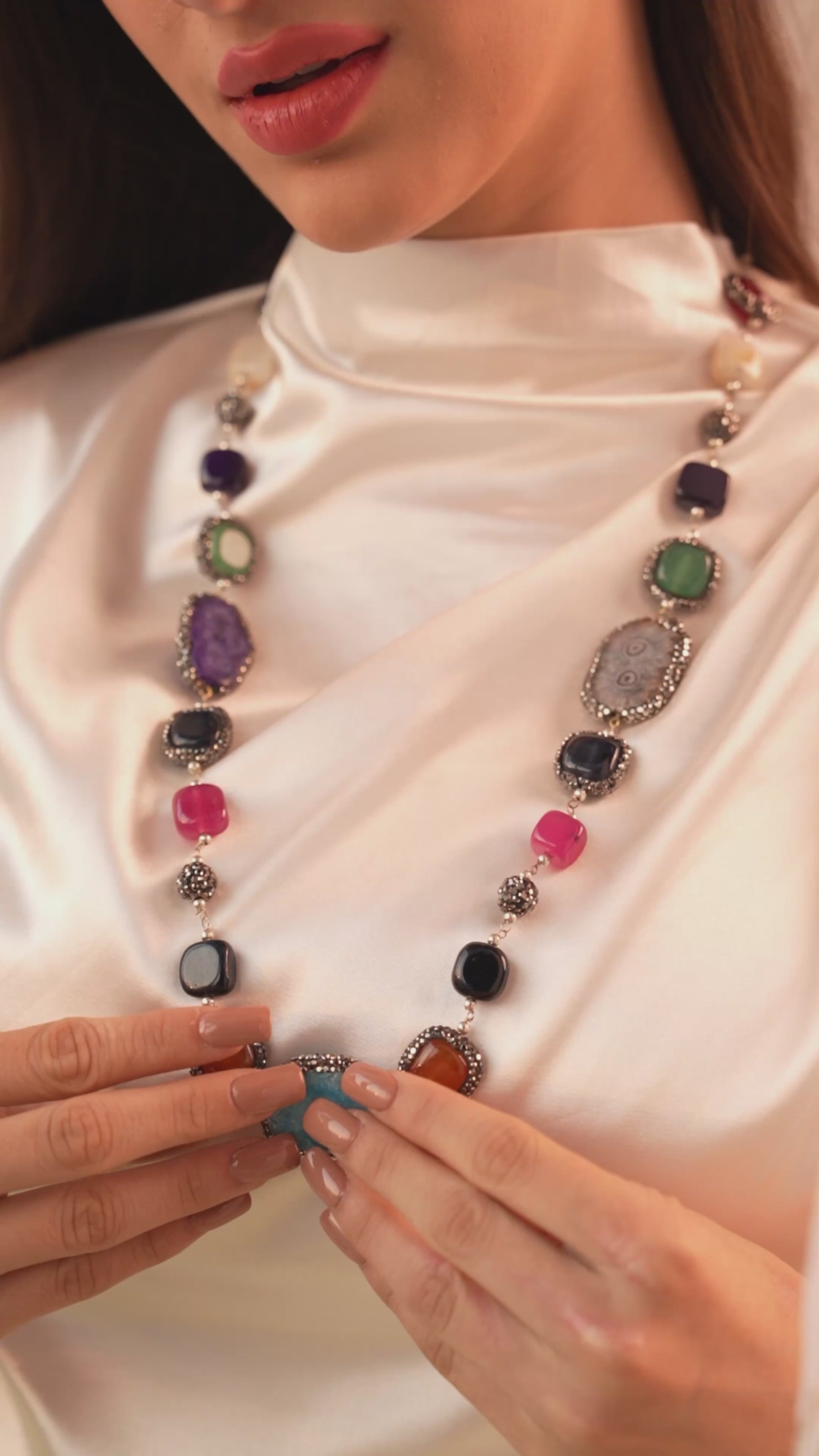 Infuse your wardrobe with vibrant elegance through this mesmerizing necklace set, showcasing gemstones in a variety of stunning hues. The arrangement of colorful stones forms a harmonious and visually captivating design, perfect for elevating any outfit.