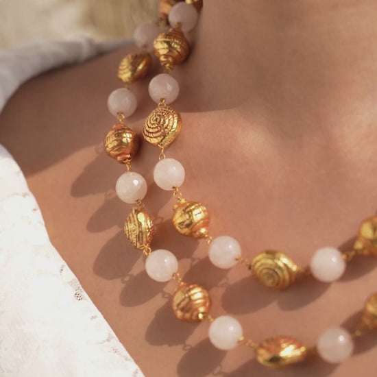This elegant double-layer necklace features a stunning arrangement of peach beads interspersed with golden tumbles, creating a sophisticated and timeless layered look. The delicate color combination adds a touch of warmth and refinement to any ensemble, making it perfect for both casual and festive occasions.