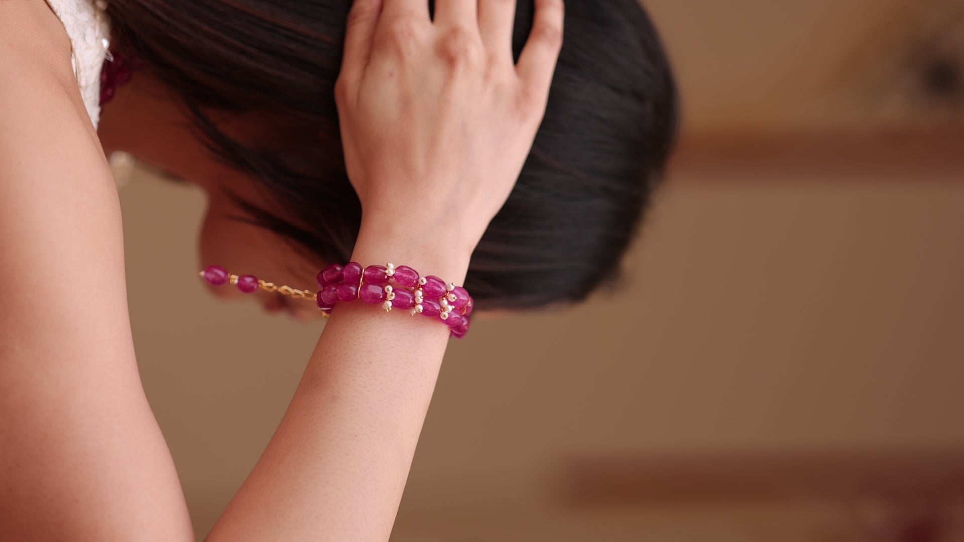 Soft blush tones meet the timeless grace of delicate pearls in this elegant two-line bracelet. The twin strands of pink beads create a subtle layered charm, beautifully balanced with luminous pearls that add a touch of refined sophistication. Light, graceful, and effortlessly chic, it’s designed to complement both festive and everyday elegance.