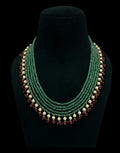 A stunning blend of deep green beads paired with elegant pearl drops and ruby-toned accents, this necklace radiates festive luxury. The multi-layered strands sit beautifully on the neckline, creating a regal, balanced harmony of colour and shine.