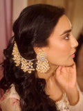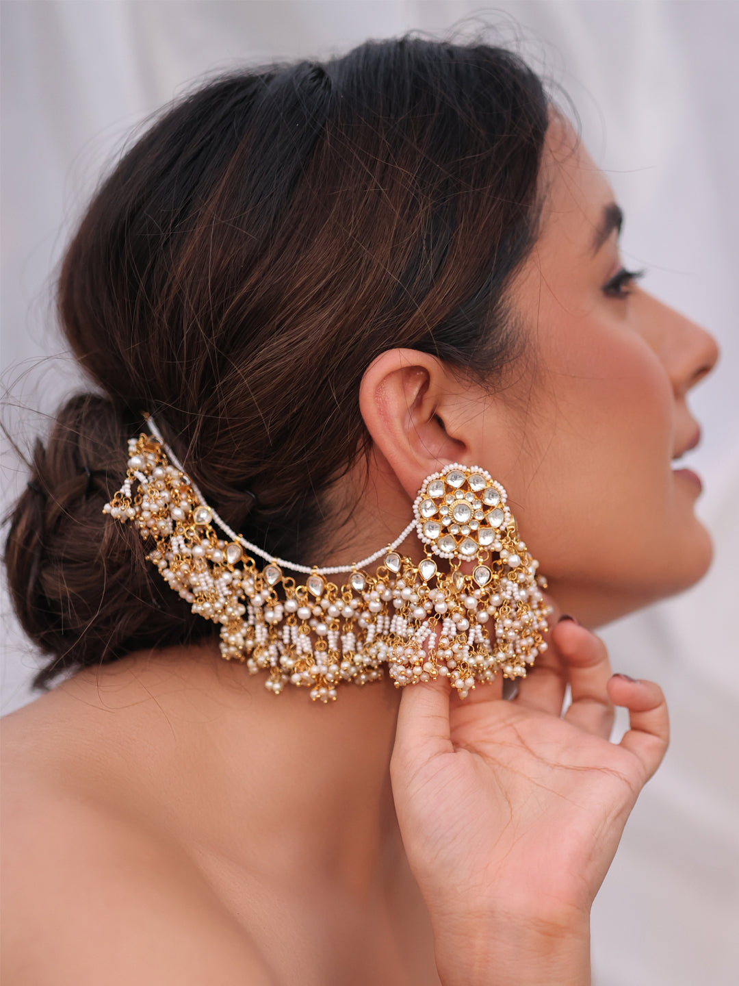 Experience the pure beauty of this stunning earchain, where pristine white tones, intricate pachi kundan craftsmanship, and lustrous pearls come together to create a truly breathtaking accessory. Its delicate design radiates timeless elegance, perfectly capturing grace and sophistication for any occasion.