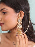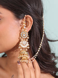Enhance your elegance with this exquisite earchain, a blend of intricate pachi kundan artistry and delicate pearls. The design radiates timeless beauty, making it a captivating addition to your jewelry collection.